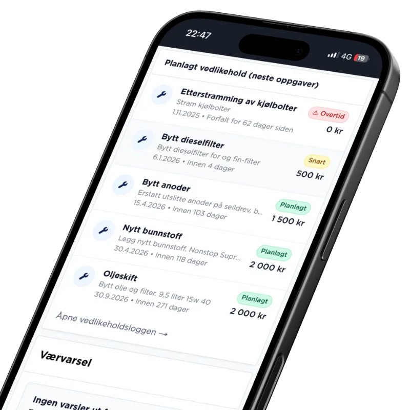 Logga utfört arbete och spara bilder och kvitton direkt från mobilen. Du bygger en komplett historik som ger dig full översikt över båtens skick och utförda investeringar.